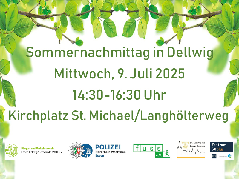 Am Mittwoch, den 9. Juli 2025, findet von 14:30 bis 16:30 Uhr ein bunter Sommernachmittag auf dem Kirchplatz St. Michael (Langhölterweg) in Dellwig statt. Besucher erwartet ein vielfältiges Programm rund um das Thema Verkehrssicherheit und Unfallprävention sowie Informationsstände der teilnehmenden Vereine und Institutionen. Zudem gibt es eine Fotoausstellung mit „Dellwiger Ansichten“, Origami to go und frische Waffeln und Kaffee. Die Veranstaltung richtet sich insbesondere an ältere Menschen und Interessierte aus dem Stadtteil – aber selbstverständlich ist jede und jeder herzlich willkommen!