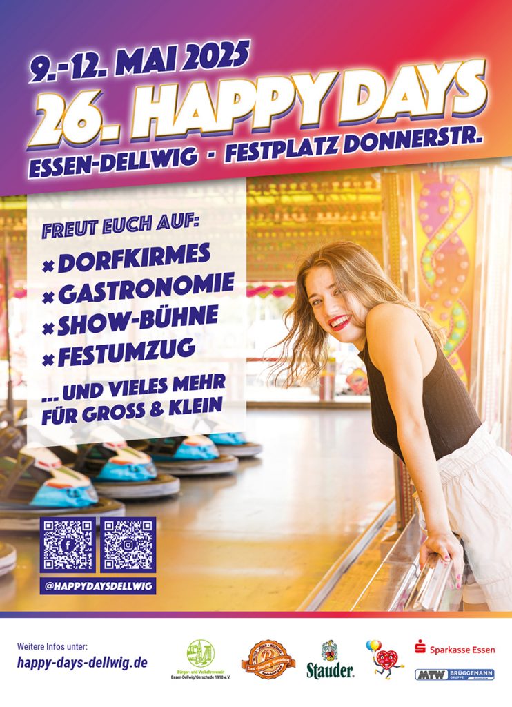 Vom 9. bis 12. Mai 2025 ist es endlich wieder so weit: die 26. Happy Days öffnen Ihre Tore am Festplatz an der Donnerstraße. Freut euch auf rasante Attraktionen, ein mitreißendes Bühnenprogramm und kulinarische Highlights. Kommt vorbei, bringt eure Familie und Freunde mit und macht die Happy Days zu EUREN glücklichen Tagen!